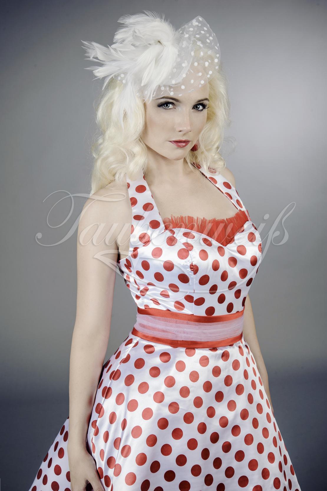 ...stellt dieses zauberhafte Abendkleid dar, das die weibliche Silhouette mit seinem weitem Tellerrock, breitem Taillenband gekonnt betont. Im unteren Rockteil wird die Tupfenlage modern gerafft, was dem Kleid einen frechen und jugendlichen Charme verleiht. Der weite Petticoat-Rock schwingt beim Laufen mit und macht sofort Lust auf eine Runde Rock’n‘Roll. Wer kann da schon widerstehen?